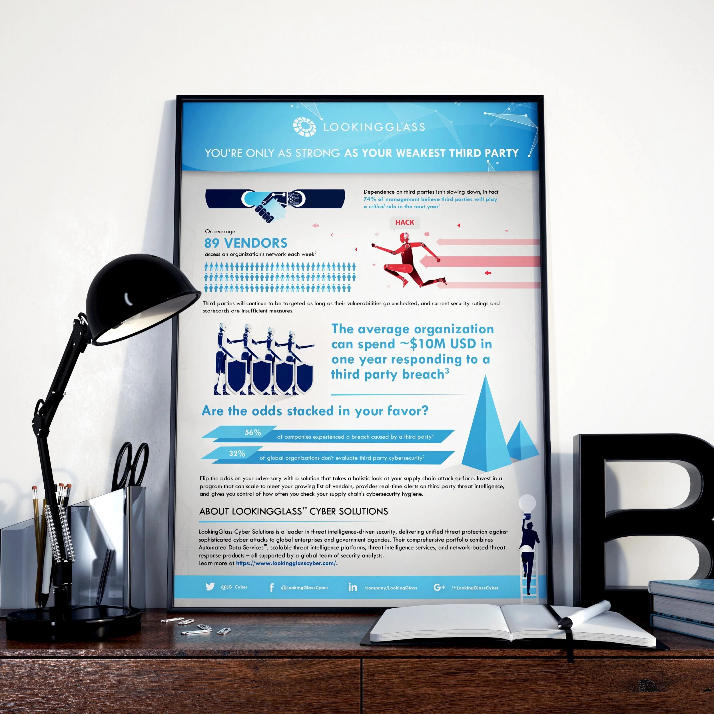 LookingGlass Cyber Solutions is dedicated to providing unprecedented understanding and response capability into cyber, physical, and third party risks. In 2019, we elevated the LookingGlass brand with more sophisticated imagery, accompanied by a refined color palette that explores the future of cyber - evolving it to include the human element, a core aspect of our value proposition. Along with our new corporate image, we’ve created an imagery system for branded vs. product collateral. This expanded image system gives the brand more opportunity and flexibility when creating both web and print collateral, as well as allows customers and prospects to associate specific imagery to our products and services. I hope you enjoy exploring our concepts and execution.